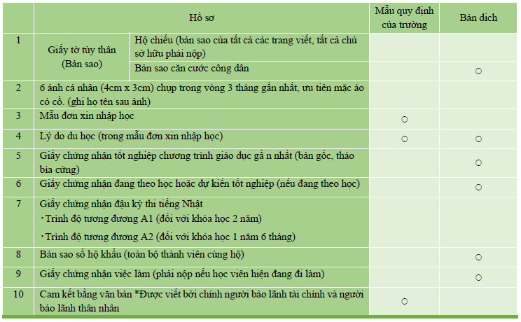 - Vào thời điểm tuyển sinh (tháng 7 đến tháng 9), có trình độ tiếng Nhật tương đương A1.