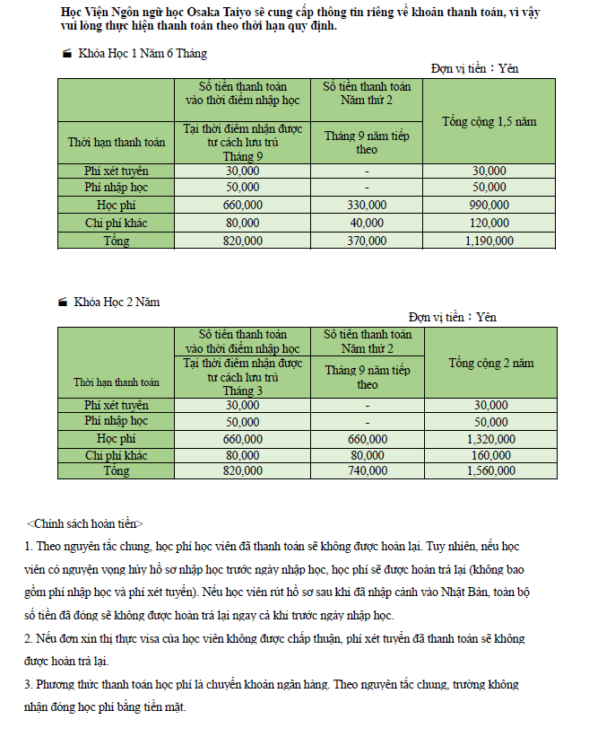 Học Viện Ngôn ngữ Osaka Taiyo sẽ gửi thông báo riêng về khoản thanh toán học phí, vì vậy vui lòng thực hiện thanh toán theo thời hạn quy định