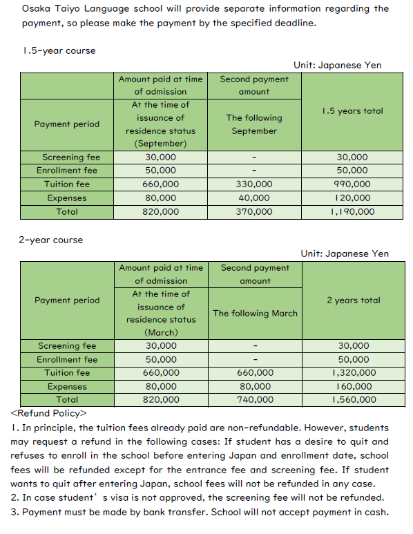 Osaka Taiyo Language school will provide separate information regarding the payment, so please make the payment by the specified deadline.